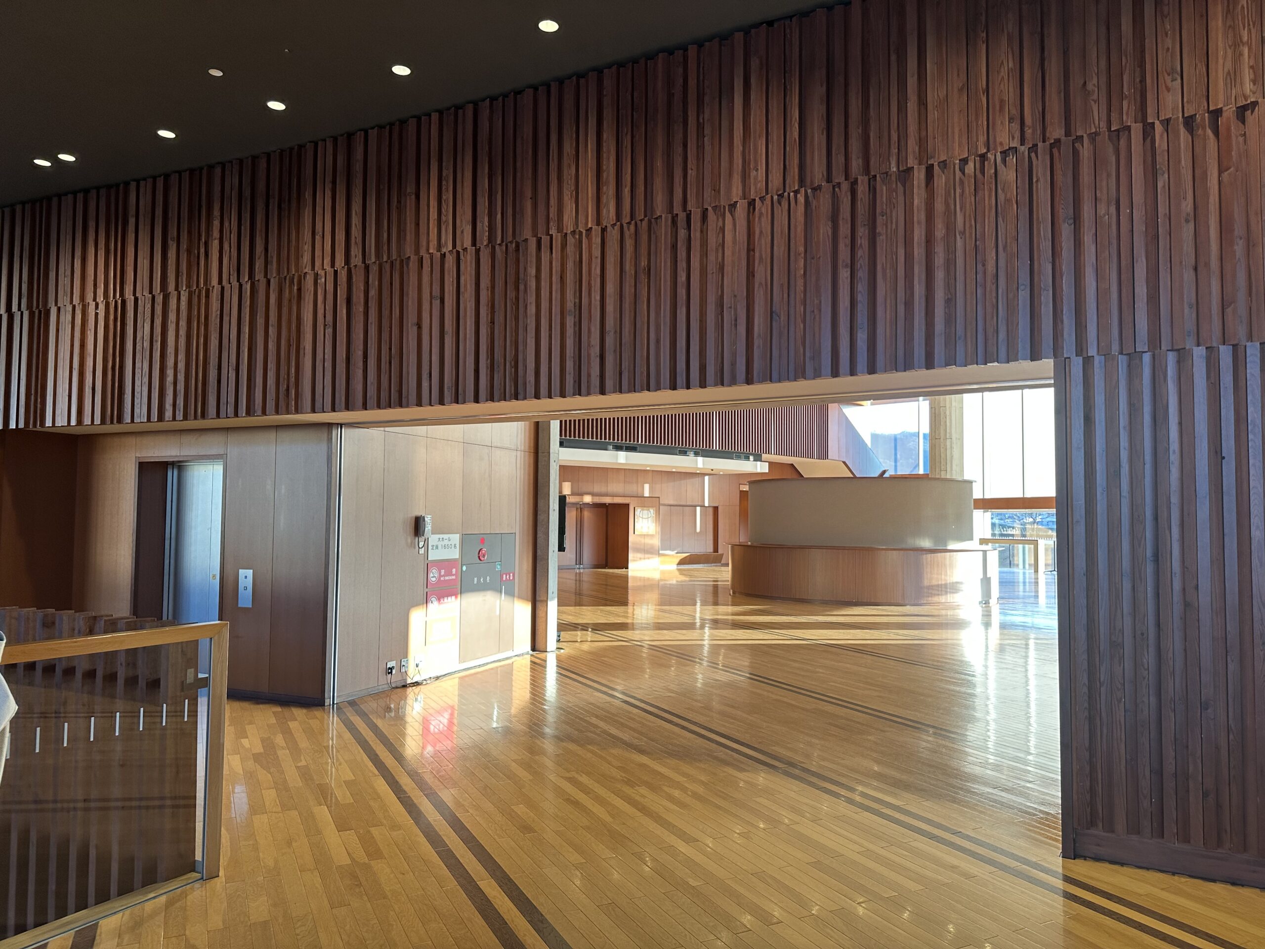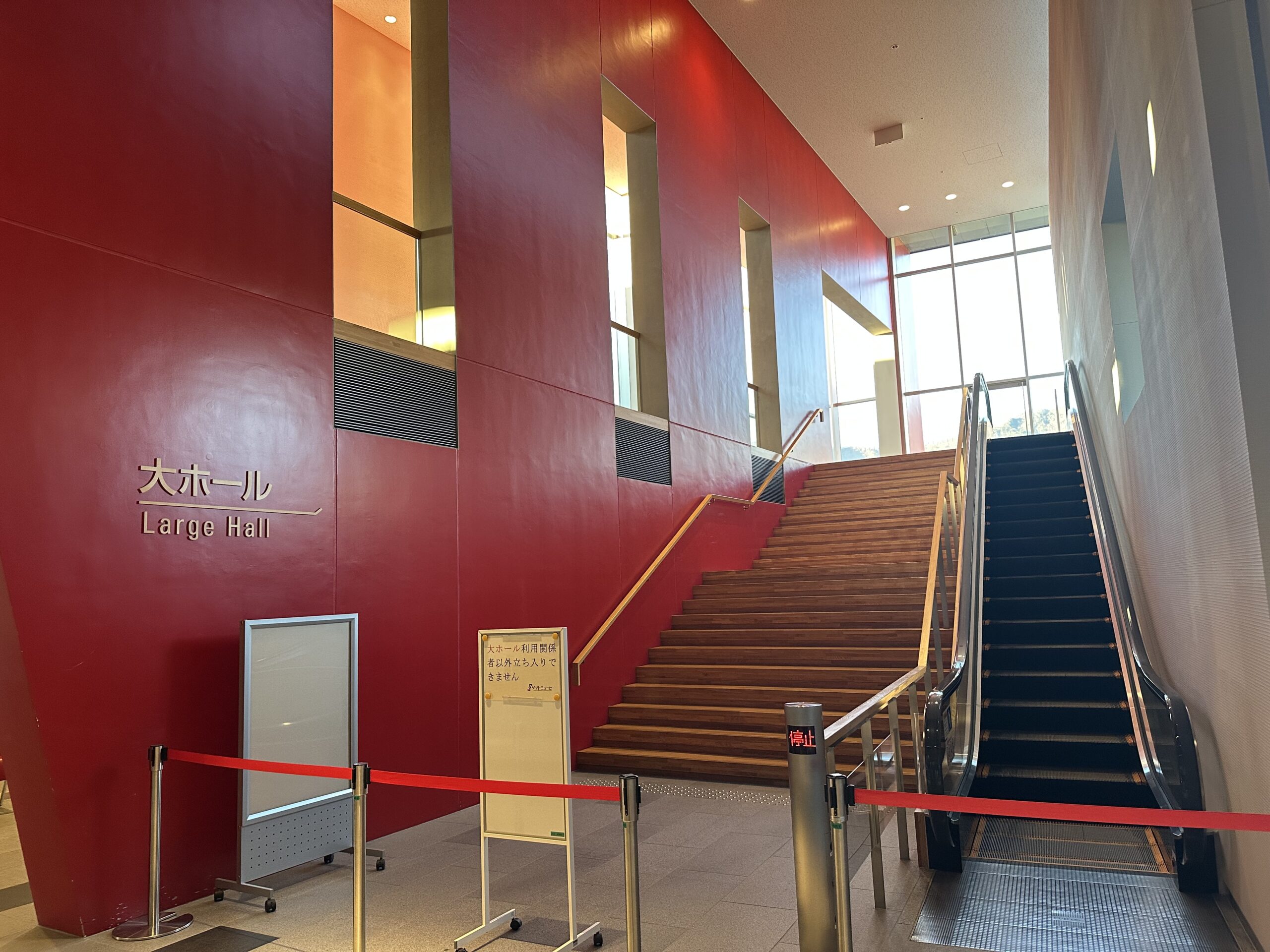 サントミューゼの入り口を入り右手に大ホールへと続くエスカレーターがございます。